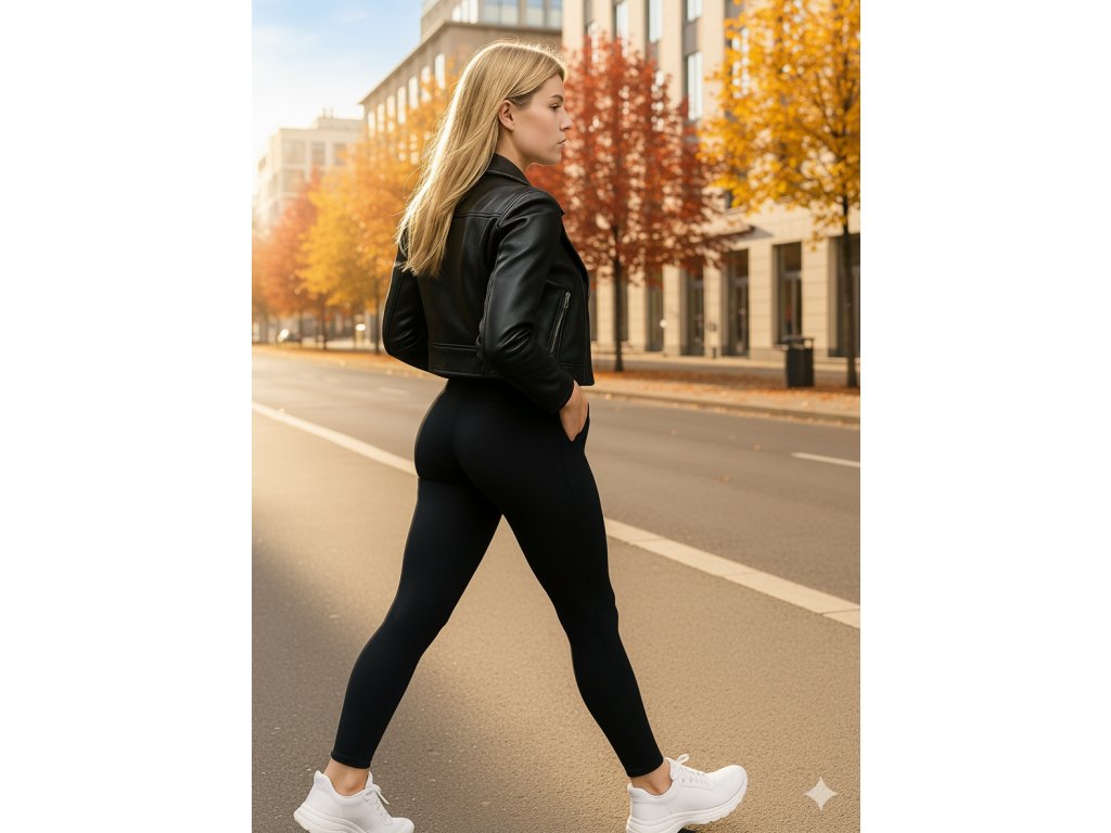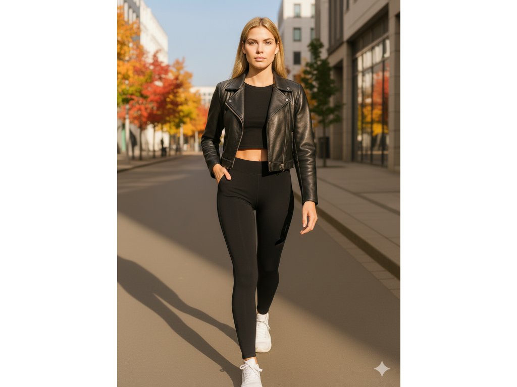 Urban styl – kůže, bomber bunda, tenisky nebo kotníkové boty — legíny působí jako univerzální základ.