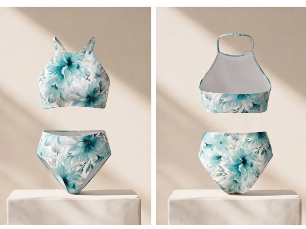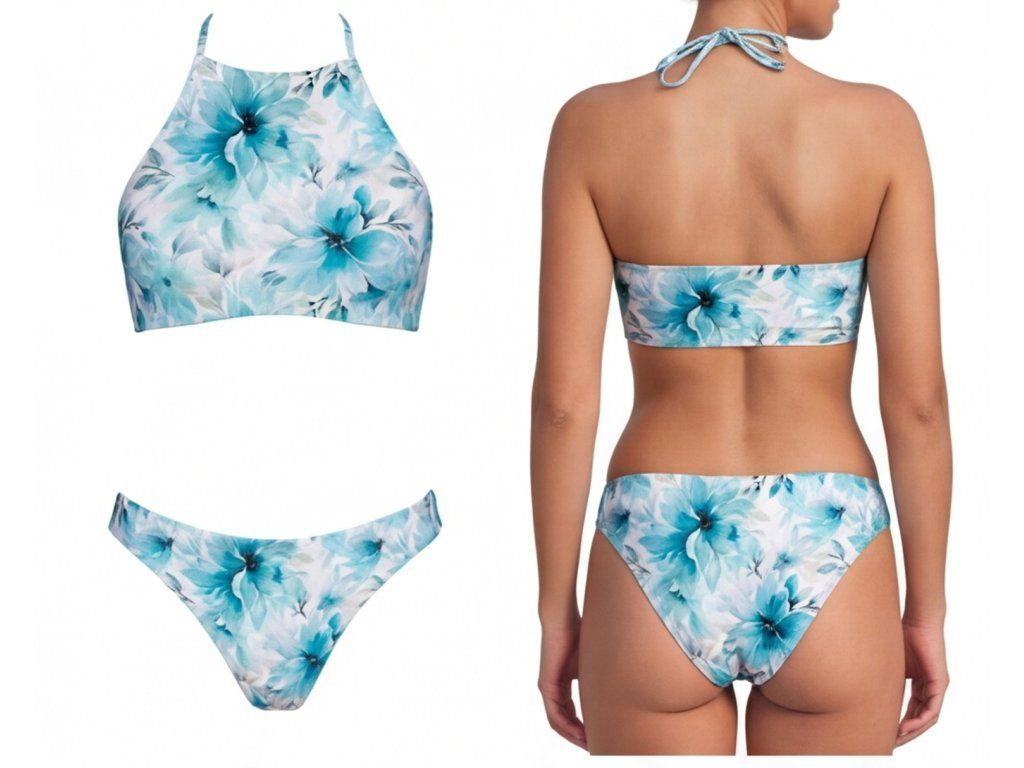 Horní díl působí elegantně a moderně díky vyššímu střihu v přední části, který dodává modelu čistý a stylový vzhled. Spodní díl ladí s horním dílem stejným květinovým motivem, takže celý komplet působí harmonicky a velmi upraveně. Tyto dámské dvoudílné plavky jsou ideální pro ženy, které chtějí vypadat jemně, stylově a zároveň nepřehlédnutelně.