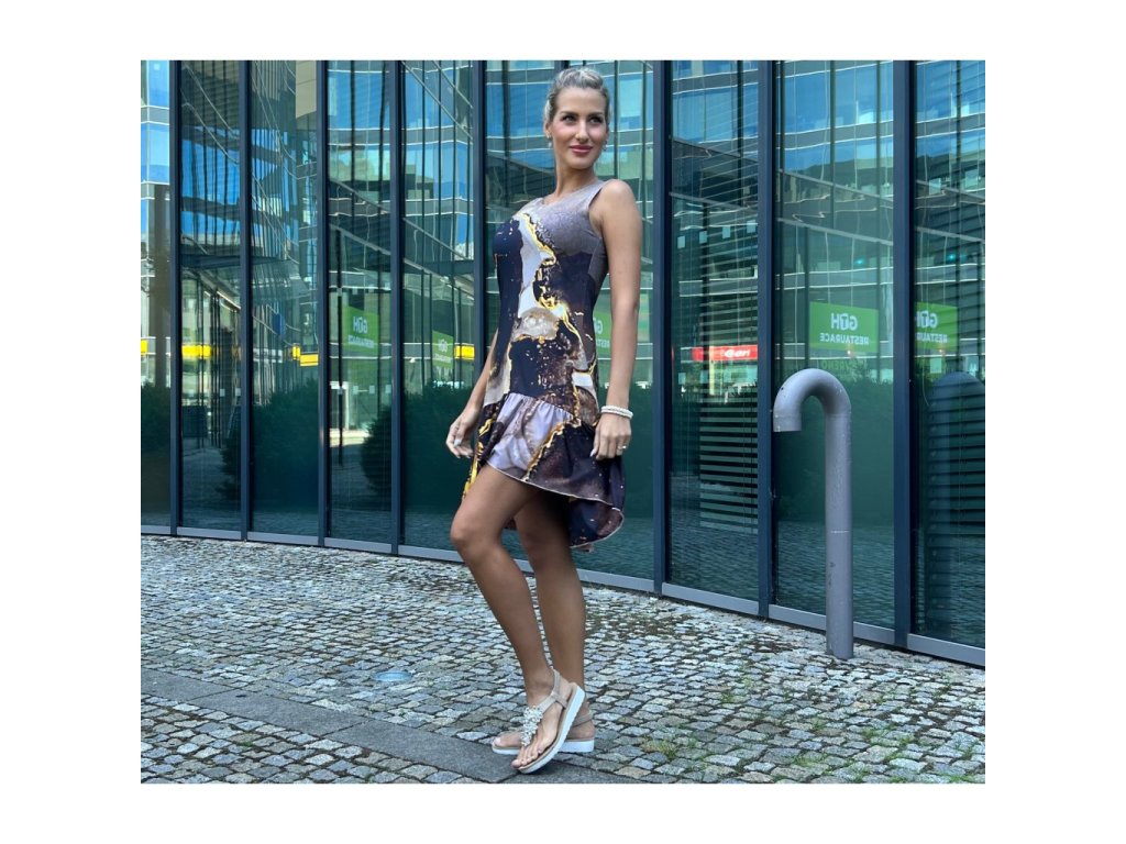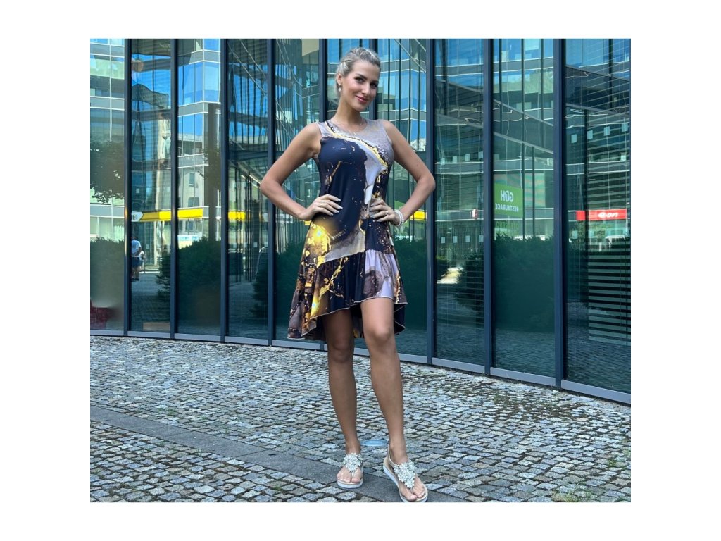 Krátké šaty s asymetrickým střihem a zlatým mramorovým potiskem. Česká výroba, prodyšný materiál, možnost úprav na míru.