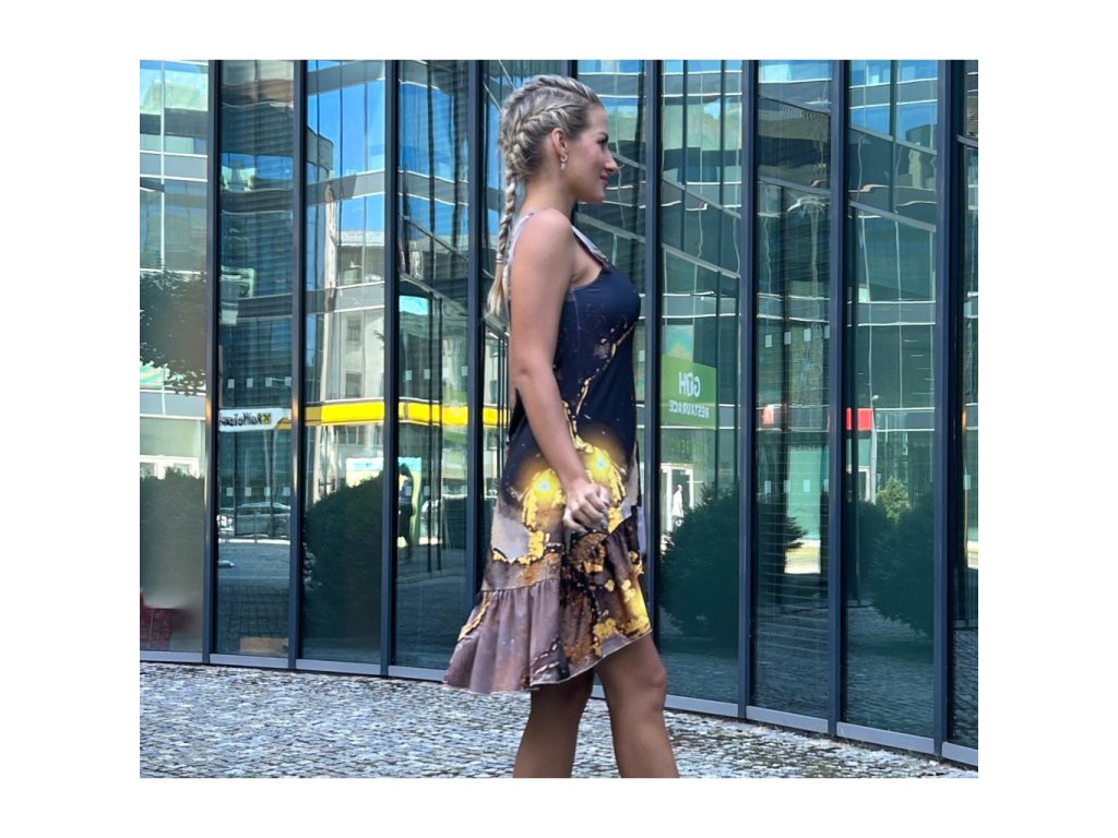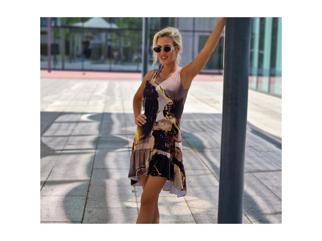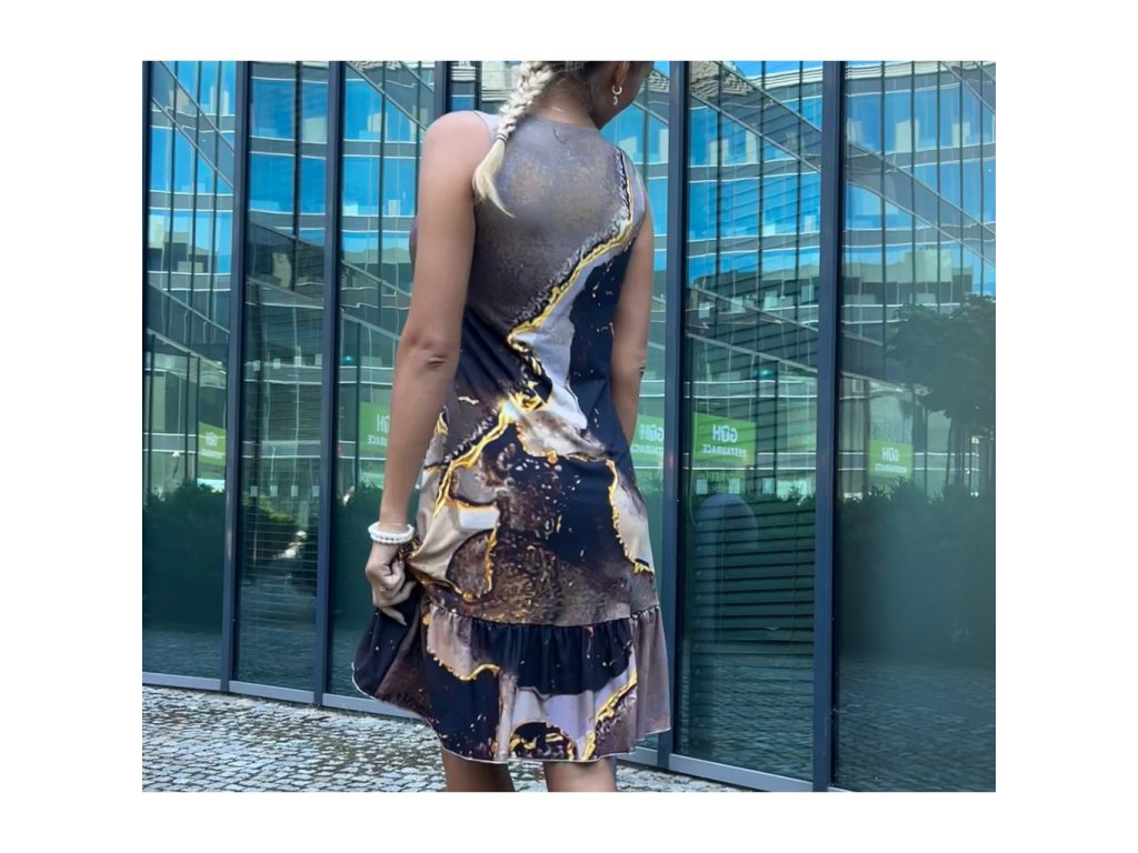 Krátké letní šaty GOLDEN SWIRL -1 zaujmou na první pohled svým luxusním potiskem inspirovaným zlatým mramorem. Elegantní barvy (černá, zlatá, hnědá, béžová) tvoří harmonický celek, který působí velmi sofistikovaně a zároveň moderně.