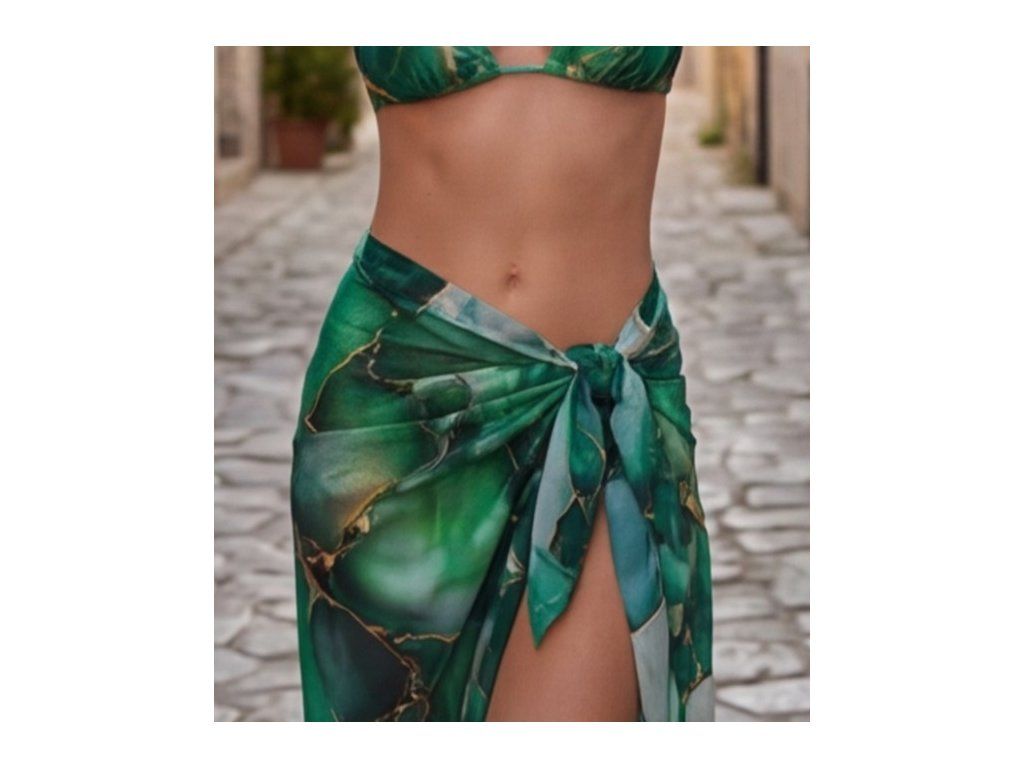 PORTOFINO EMERALD Luxusní dámské pareo je elegantní plážový doplněk, který dokonale navazuje na plavky ve stejném designu. Smaragdově zelené tóny se zlatým mramorovým efektem působí luxusně, svěže a velmi žensky. Pareo dodá vašemu plážovému outfitu lehkost, styl a pocit dokonale sladěného letního looku.