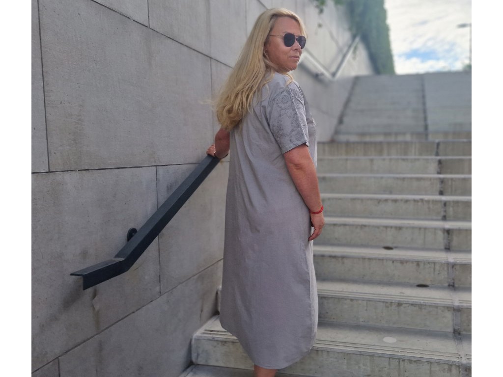 To jsou béžové letní šaty s výšivkou a jemnými detaily. Volný, pohodlný střih doplňují krátké rukávy, výstřih do V s knoflíčky a krásné výšivky v horní části i u spodního lemu.
