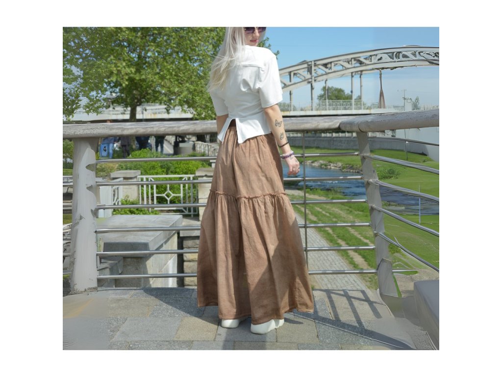 Hnědá přírodní barva krásně ladí s bílou, béžovou nebo i džínovinou. Sukně má elastický pas, díky kterému perfektně sedne a zároveň zaručuje pohodlí po celý den. Ideální na dovolenou, festival nebo jen tak do města s páskem a jednoduchým tričkem.