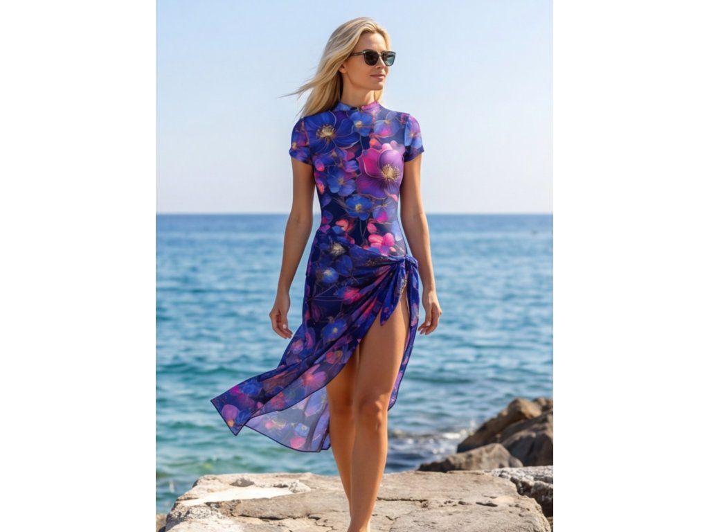 TAORMINA NOTTE Luxusní dámské pareo je stylový a ženský doplněk, který dokonale doplňuje plavky ve stejném designu. Tmavě modrý základ s výraznými květy v růžových, fialových a modrých tónech působí elegantně, luxusně a velmi atraktivně. Pareo dodá vašemu plážovému outfitu lehkost, sofistikovanost a pocit výjimečnosti.