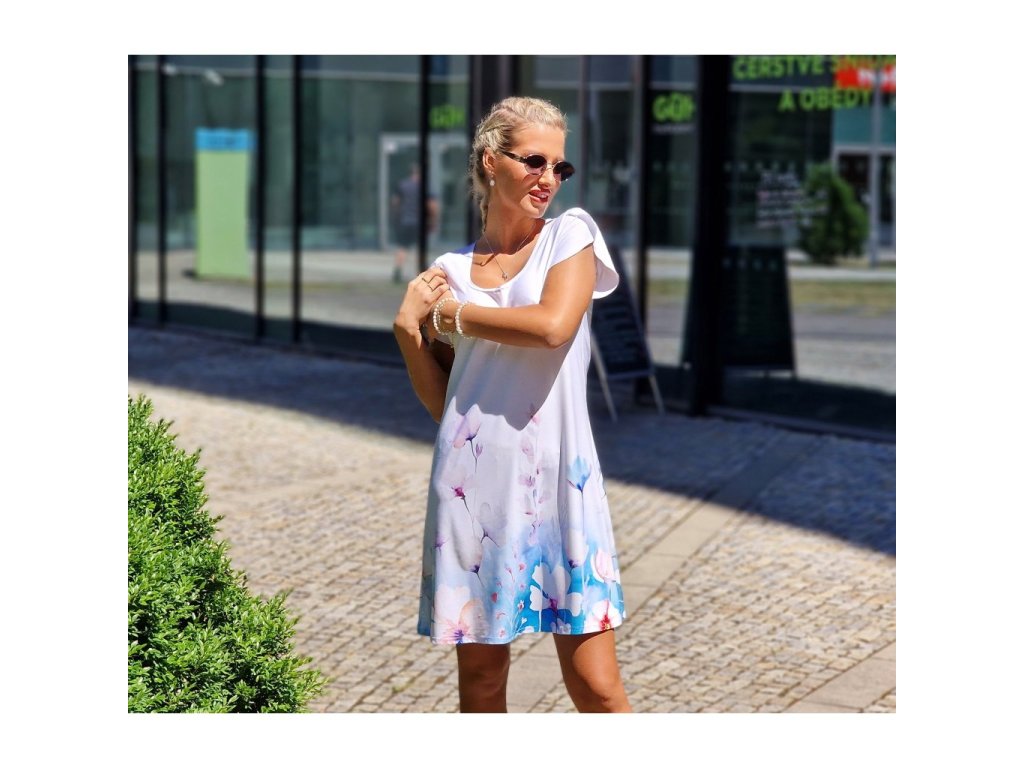 Šaty White Blossom jsou ztělesněním letní něžnosti. Čistě bílý základ doplňuje jemný akvarelový květinový potisk v odstínech fialové, modré a růžové, který šatům dodává vzdušnost a svěží umělecký dojem. Tyto šaty působí jednoduše a přitom velmi stylově – ideální pro všechny milovnice romantické elegance.